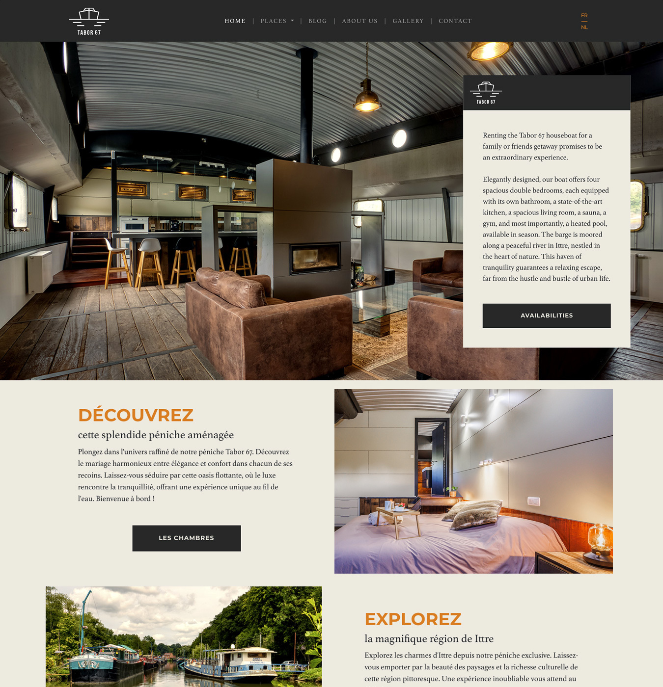 In 2022, Pierre & Leslie Linder had just acquired their new converted barge called Tabor 67. It became urgent to communicate about this new place intended to be rented to tourists. Not having a lot of resources at the beginning, we recommended a small "one-page" site allowing them to both show photos of the place as well as communicate about their place and the services they offered.